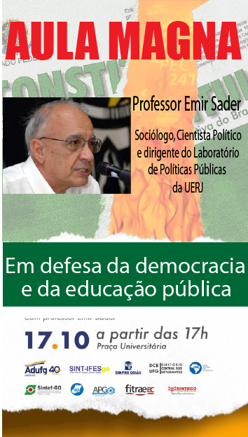Tendo em vista a importância de defender a democracia e a educação pública, o Adufg-Sindicato, SINT-IFESgo, Sinpro Goiás, Sintef-Go, Sintego, FitraeBC, APG, UEE-GO e DCE/UFG promovem aula magna sobre este mesmo tema nesta quarta-feira (17/10), a partir das 17h, na Praça Universitária. Emir Sader, sociólogo, cientista brasileiro e doutor em ciência política pela Universidade de São Paulo, é o especialista convidado para a aula.